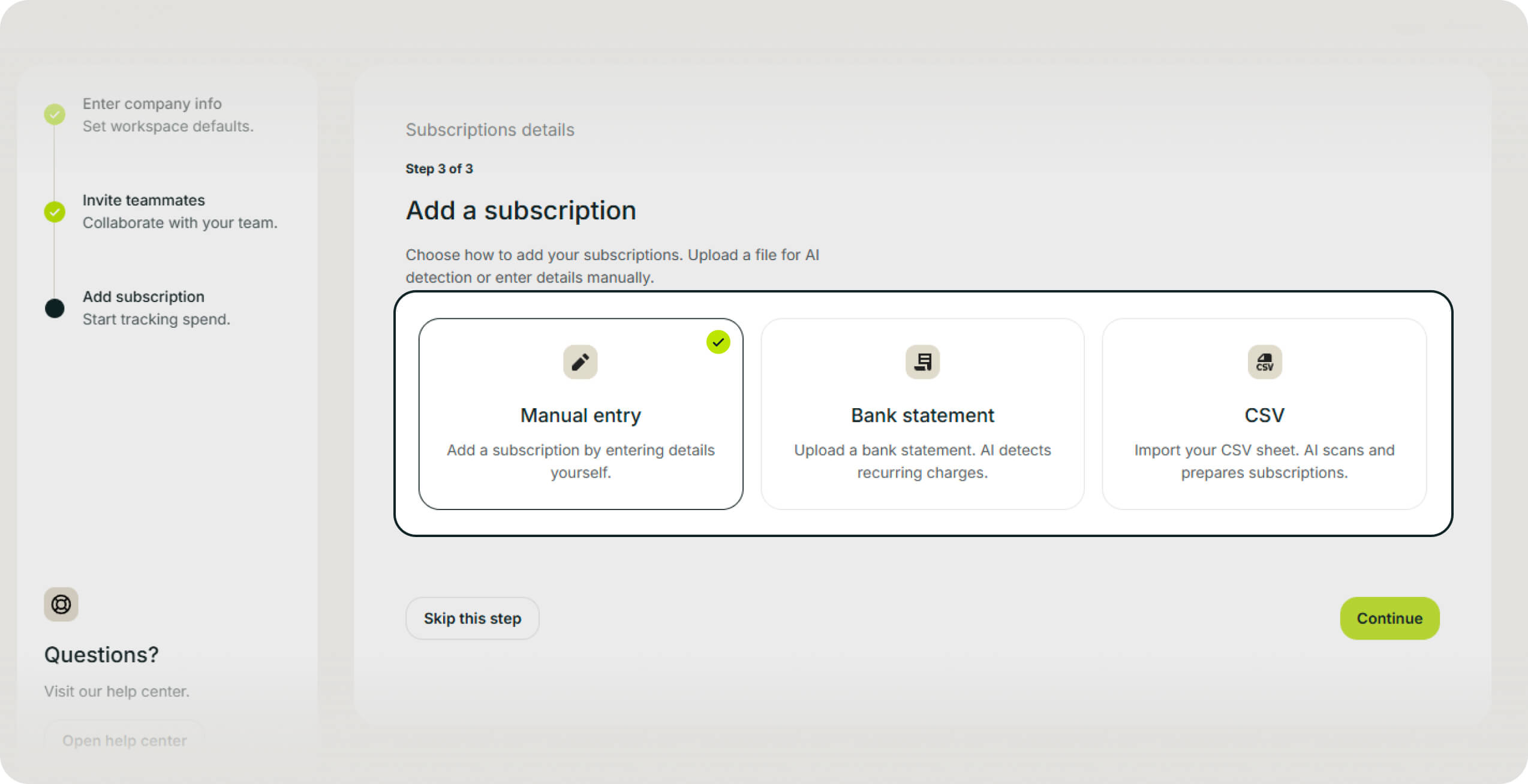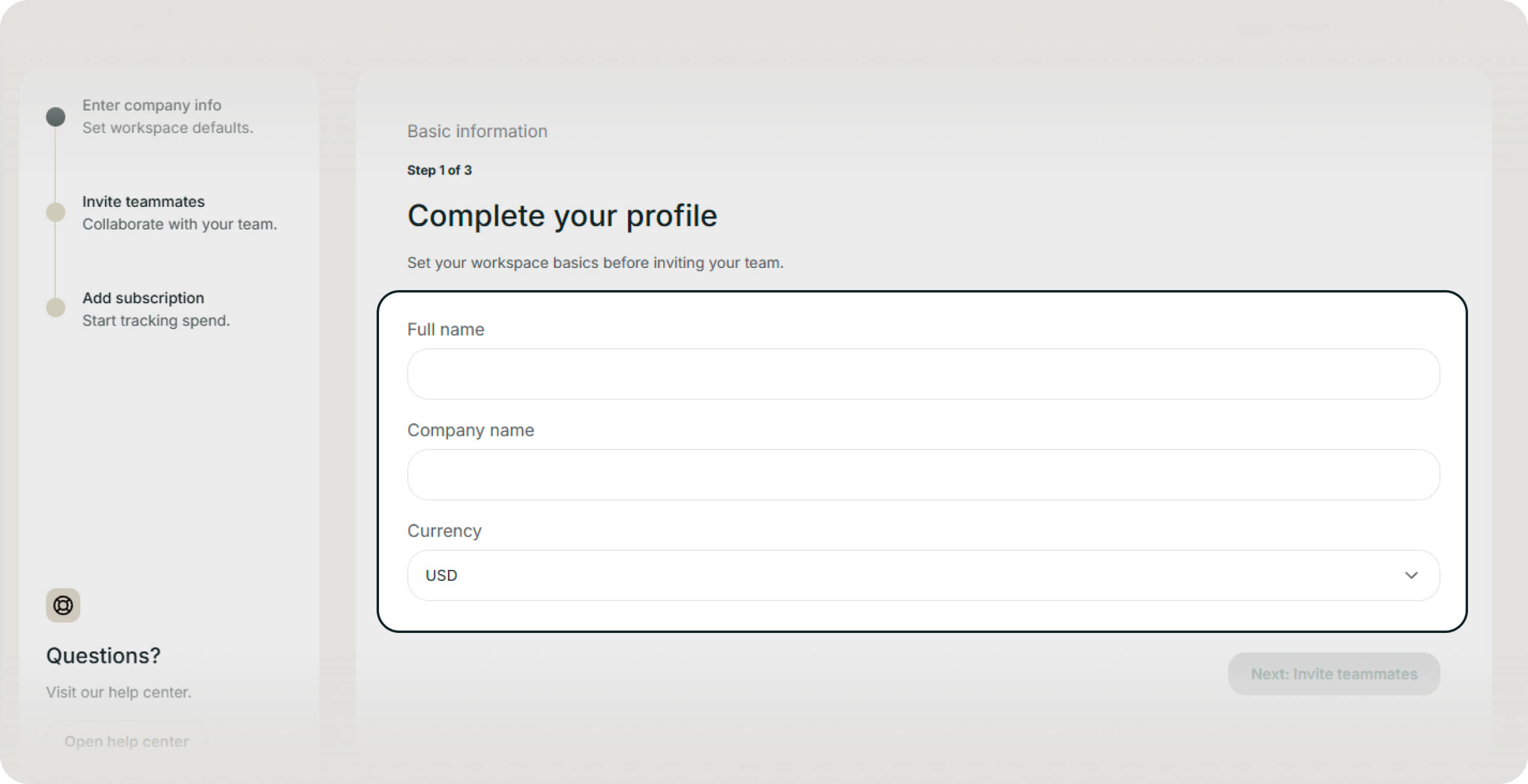Once logged in, you will enter the workspace setup wizard.